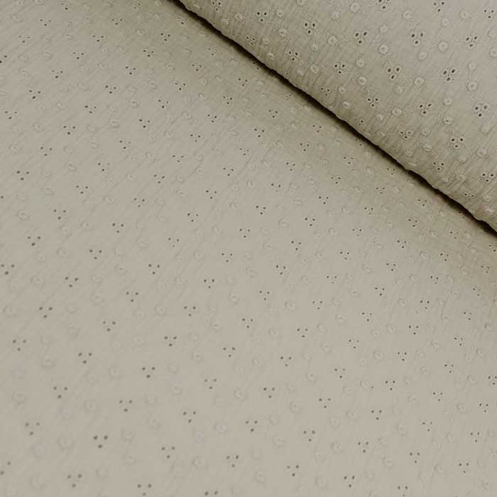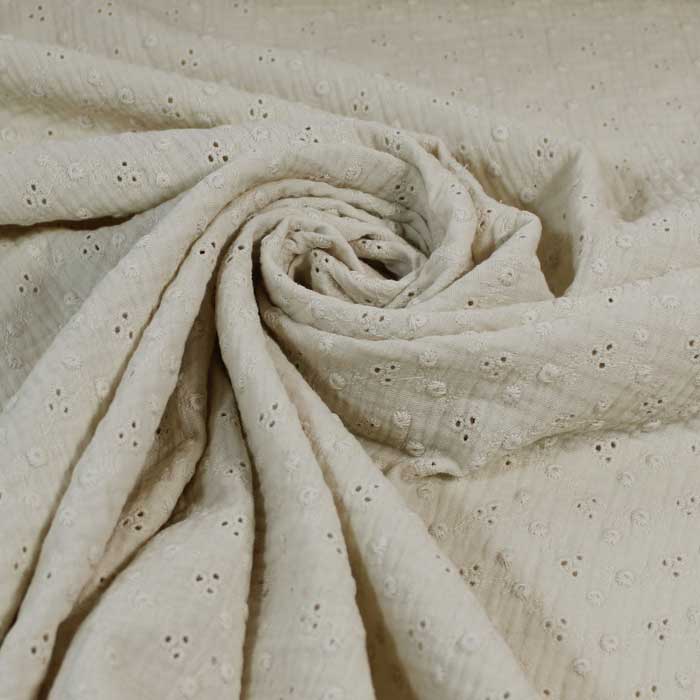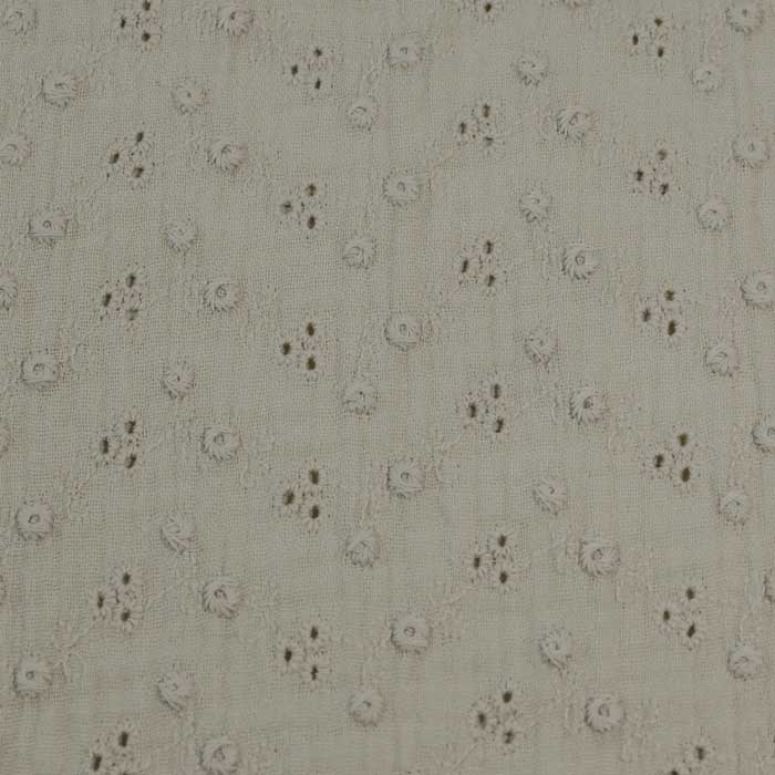 Tessuto composto di due strati di garza legati insieme da piccoli puntini impercettibili. La garza ha una trama larga che rende il tessuto leggero e delicato.
